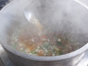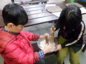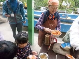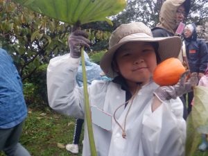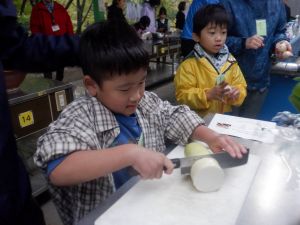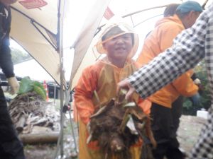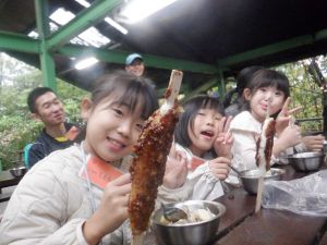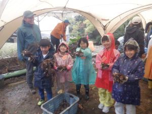 春のもぐもぐの会(4/5)で子どもたちに植えてもらい、7ヶ月かけて大きく育った里芋を収穫しました。初めて挑戦した菌ちゃん農法のおかげか昨年よりも収量がアップしました!その後、グループに分かれて、雨に濡れて色が鮮やかになった紅葉を楽しみながら探検しました。お昼は採れたて里芋や根野菜いっぱいの「芋っこ汁」を大釜で作ったり、ゆうちゃんが釜炊きしたご飯で「五平餅」を焼いたりしておいしくいだただきました。