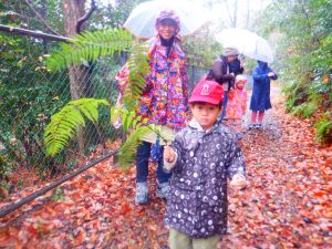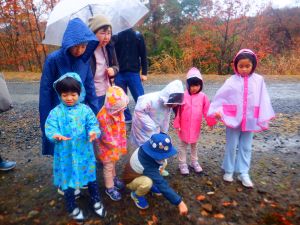 少し雨がぱらついておりましたが、水が傘にポツンと落ちる音や、足元の水たまりを踏んでみた感触など、雨ならではの散策を楽しむことができました🎵みんなでウラジログライダーを飛ばして楽しんだり、足元に広がる落葉したタカノツメの甘い匂いを嗅いで自然を満喫しました。