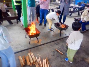 散策後は炊事場に移動して火を起こして「焼き芋づくり&クラフト」です