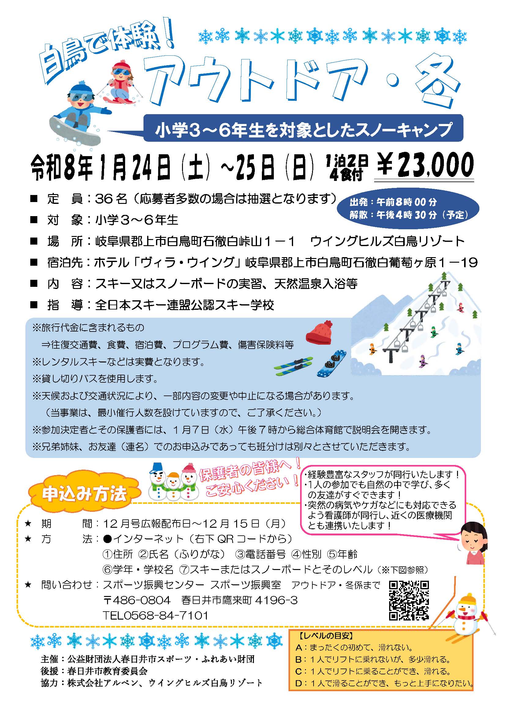 内 容:市内小学生が親元を離れ、仲間たちとともにスキーまたはスノーボードの体験を行うほか、温泉入浴等を